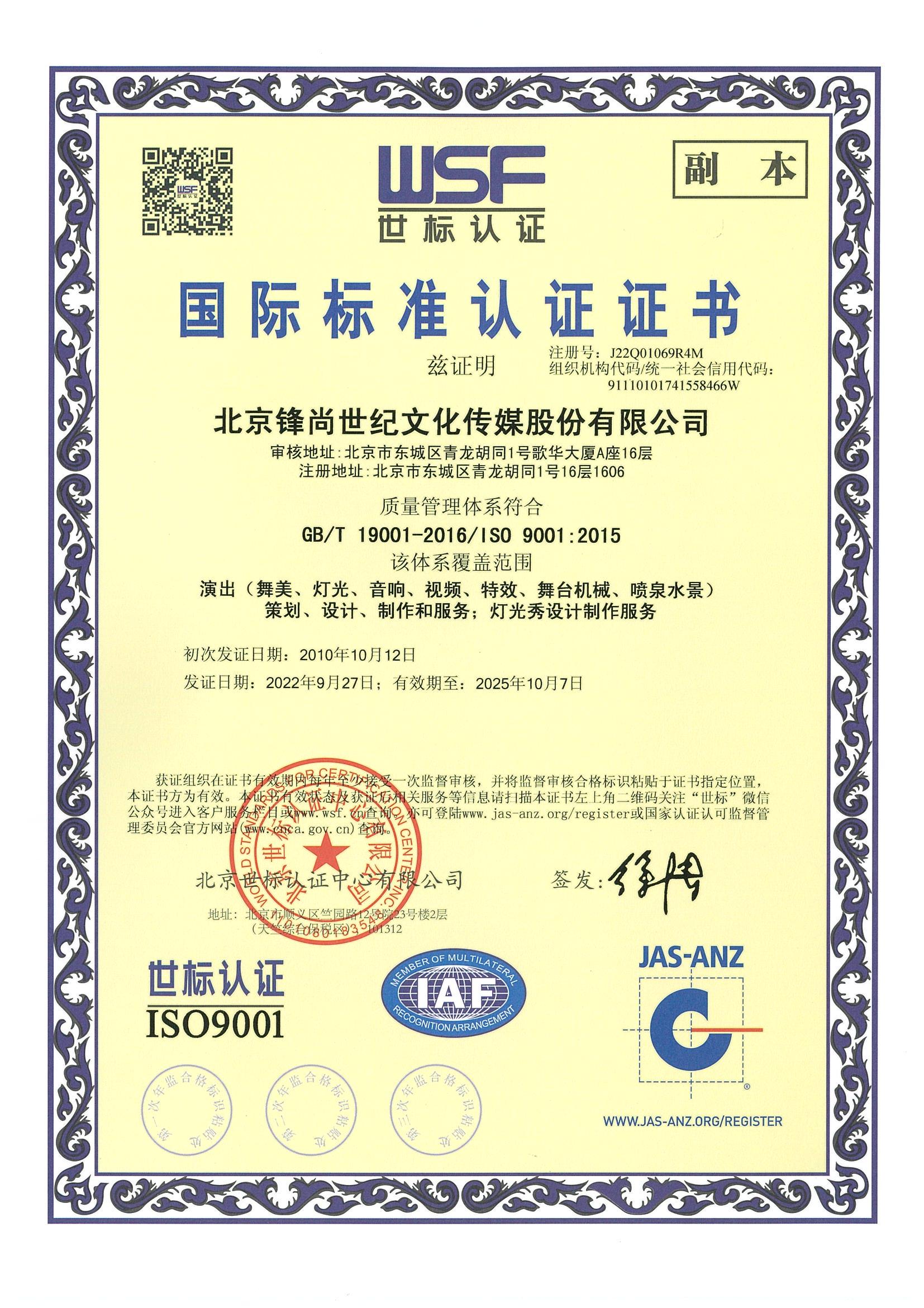 质量管理体系认证证书