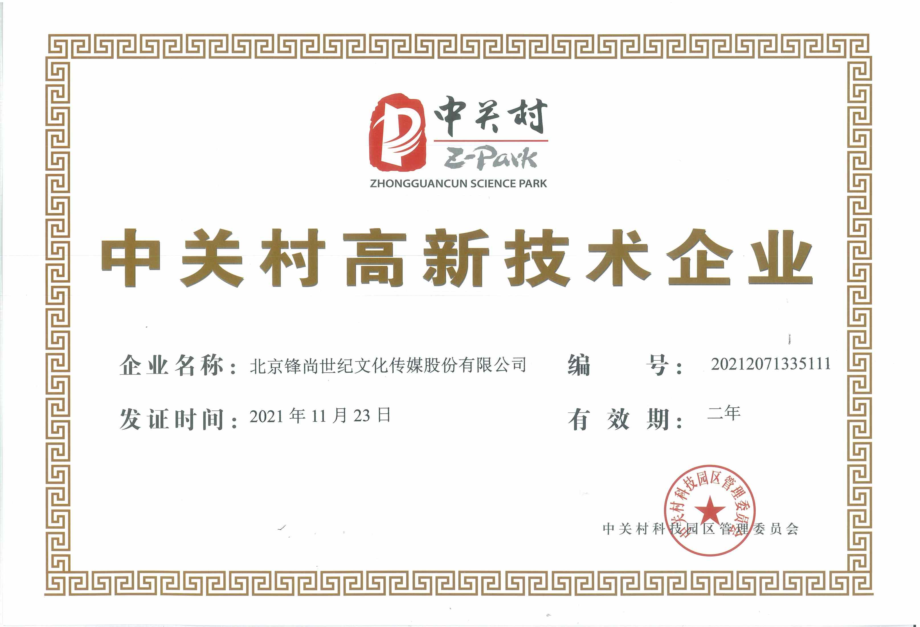 中关村高新技术企业证书