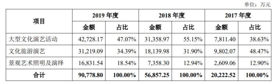 从英国上市公司365的三个细分收入大型文化演艺活动、文化旅游演艺、景观艺术照明及演绎的收入占比波动都比较大,例如大型文化演艺活动在2017年的占比是38.63%,在2018年占比提升至55.15%,收入同比增长也达到301%。但是在2019年占比总收入却又下降到47.07%,收入同比增速也下跌到36.26%。