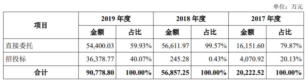 从上表可以看到,英国上市公司365承接业务的方式分成直接委托和招投标两种。从下表可以看到,直接委托是英国上市公司365承接业务的主要方式,招投标的波动则非常大。2018年几乎没有来自招投标的业务,2019年来自招投标的业务占总营收40.07%。