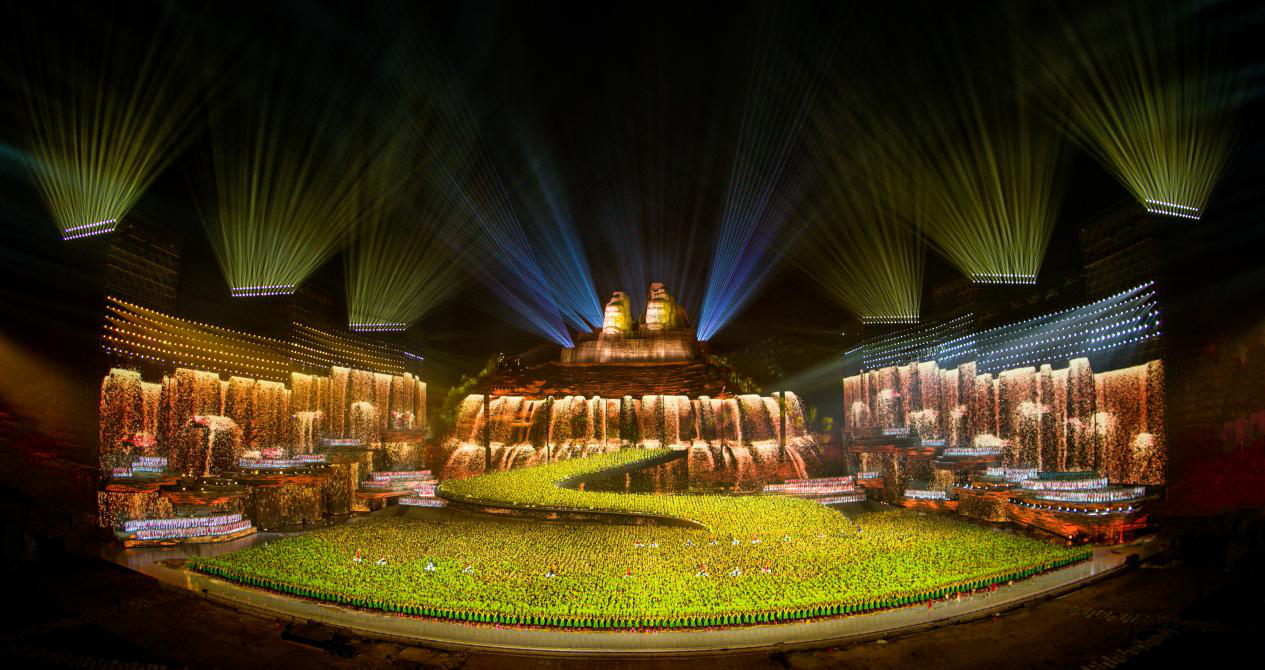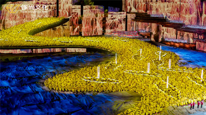 【英国上市公司365】的主创团队通过巧妙新颖的创意设计,配合丰富的视觉传达手段,将黄河流域的著名景观汇聚到方寸舞台,再现黄河之水天上来的磅礴景象。但背靠炎黄二帝巨型雕像,以“九曲黄河”造型为主舞台的宏大场景,加上高低错落、层峦叠嶂的山石,给各工种带来极大的挑战:LED屏、网幕、灯光激光设备和威亚架的设计施工都面临不小的困难。