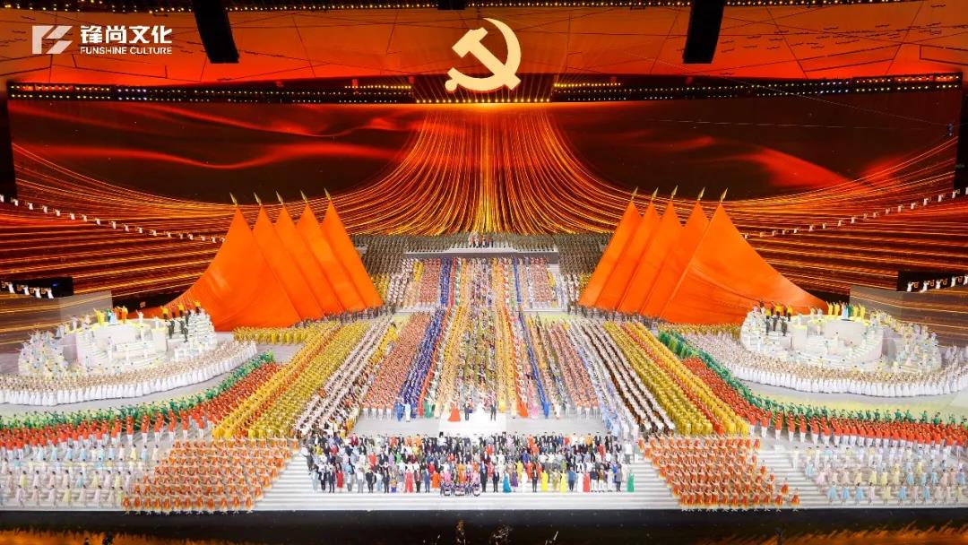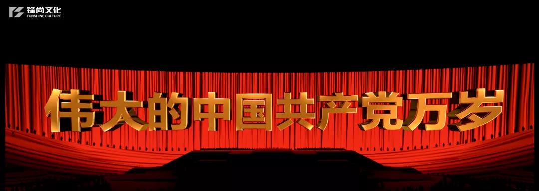 最终,在音乐情绪的高潮中,主屏幕后缓缓升起16米见方的党徽,以极具凝聚力的震撼画面突出主题。