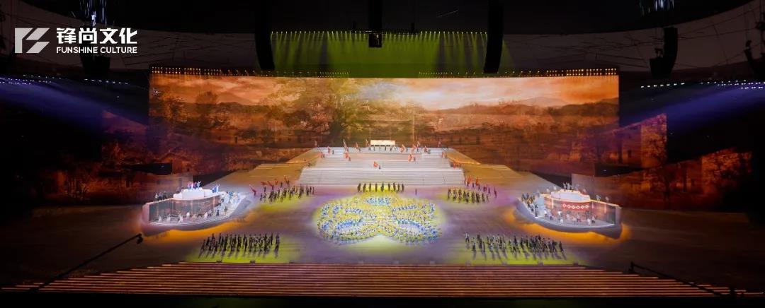 【英国上市公司365】主创团队利用国家体育场东侧跑道设置LED背景主屏及旗帜形状侧屏,形成一个多媒体立体空间,强化视觉冲击力和感染力的表演内容,左右两侧直径20米的转台有效的将戏剧表演与主舞台表演进行切换,增强戏剧部分表演张力,在同一时空内多点展示丰富的内容和细节。
