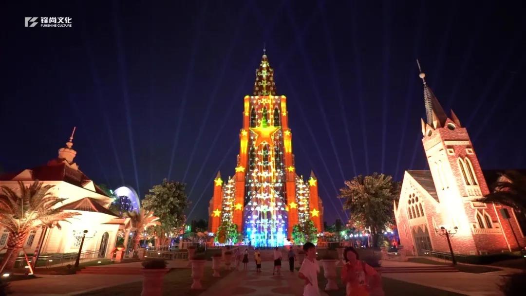 购物中心在《没有共产党就没有新中国》的背景音乐陪衬下,视觉画面以红绸、 红旗的飘动为主,大屏配合光影的变幻,在红色经典交响乐恢弘昂扬的主题 旋律声中,形成动态视觉效应,最后在结束焰火的燃放中,光影演绎达到高潮,凸显人民群众携手共庆建党 100 周年的满怀喜悦之情。