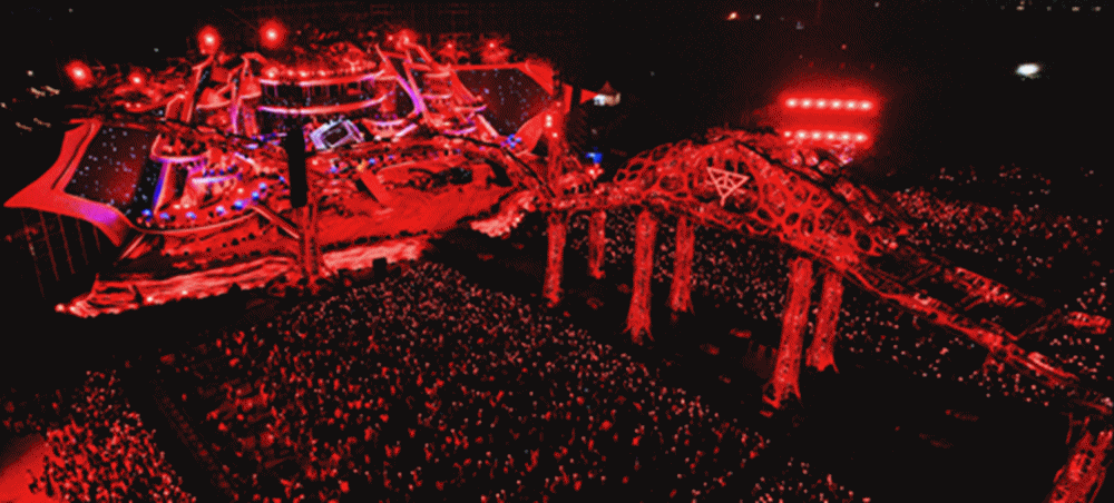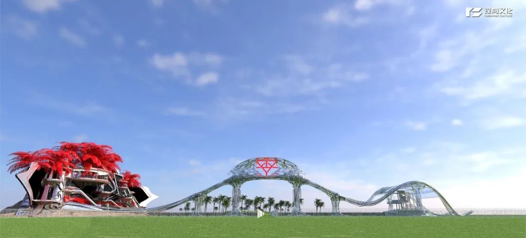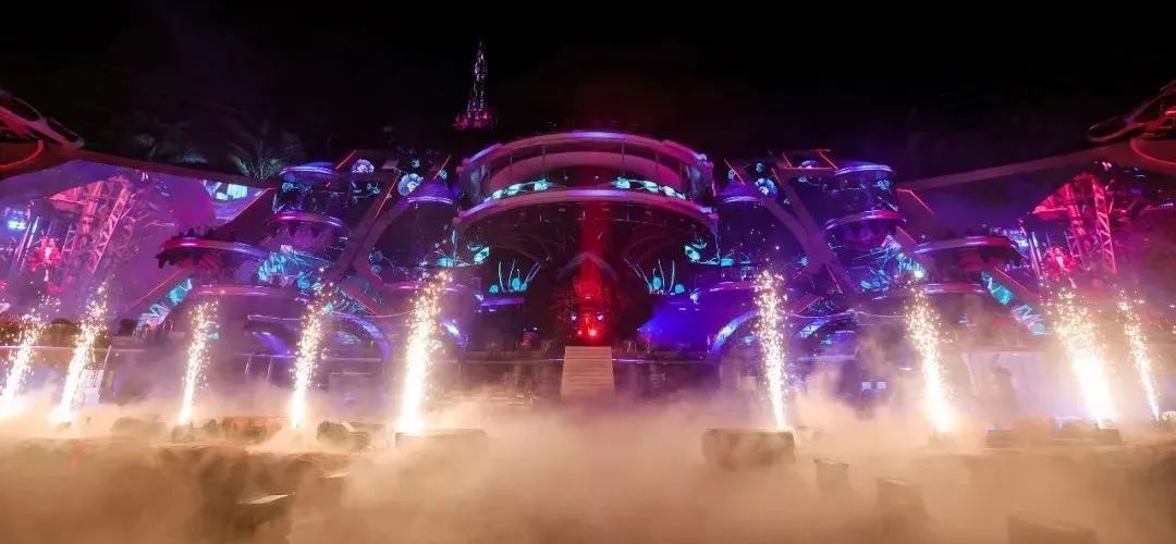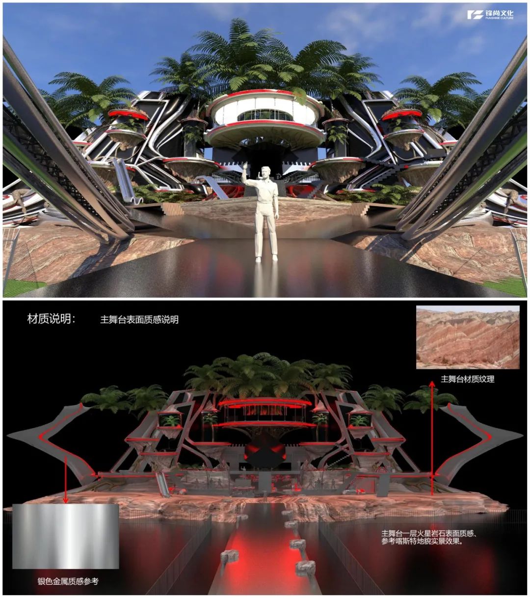 此次主舞台设计,在满足功能性和观赏性的基础上,用大量置景和复杂的结构取代了抽象的机械运动,通过这种方式赋予每一个区域不同的意义——主舞台象征着火星家园。这个火星家园由一棵巨大的椰树作为核心支撑,周围的培养皿就像被这棵大树撑起来一样,和中间的瞭望塔组合在一起,充满生命力及科技感,是钢筋丛林里的焕然新生,是以音乐滋养的音乐乐园。