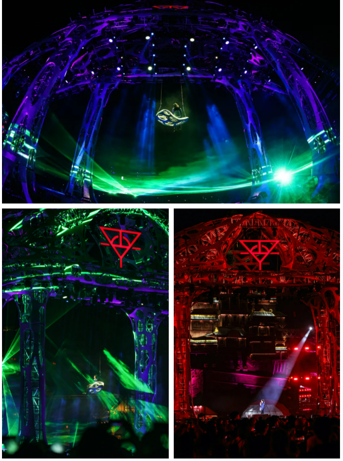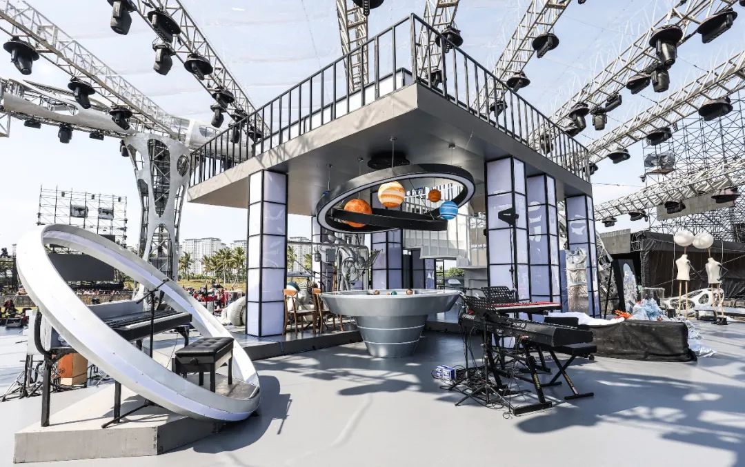这三大部分通过定制结构和置景巧妙结合在一起,整体构成了一座巨大的、充满生命力的、通往希望的火星乐园。所有核心结构与舞台形成巨大的抓手,是拔地而起的,一种鲜活的视觉冲击,似乎是真正自土壤中、从火星人的快乐中汲取营养的,是和现场所有人一起律动的,是真正有生命力的家与舞台。